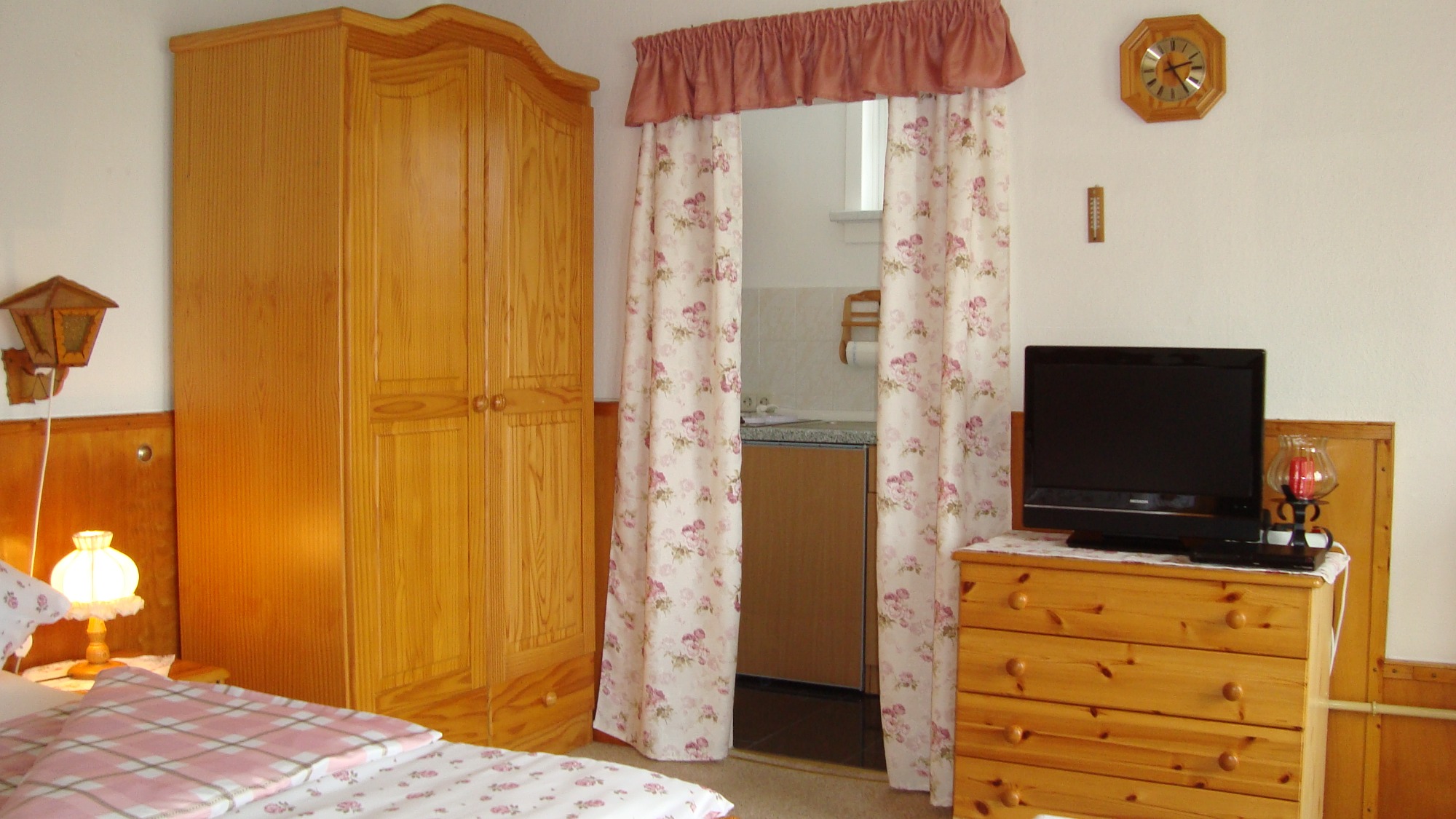 Wohn-/Schlafzimmer, Küche mit zwei Kochmöglichkeiten, Kühlschrank, Gefrierfach, Spüle, Kaffeemaschine, Toaster, Wasserkocher, komplettes Geschirr, Putz- und Reinigungsmittel, Dusche/WC, Toilettenpapier, TV, Radio, Heizung, kostenlose Fahrrad- und Motorradgarage, komplettes Prospektmaterial über die Region sowie Wanderkarten